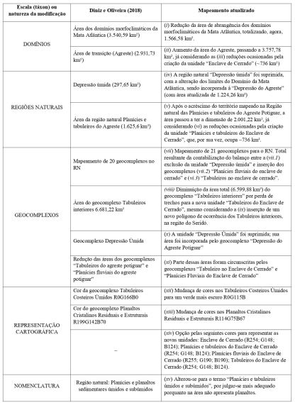 Destacam-se onze pontos, modificando os resultados obtidos anteriormente na função da classificação das unidades de paisagem para o estado do RN e destacamos a nova delimitação da tributação dos domínios morfoclimáticos, regiões naturais e geocomplexos, na função de reclassificação utilizando diferentes isoietas pluviométricas do mapeamento anterior (de 1.000 mm a 1.200 mm) e refinamento do mapeamento; a inserção de um enclave (fechado); nas regiões naturais, uma área antes denominada "Depressões Úmidas" foi incorporada à unidade "Depressão do Agreste Potiguar" e ampliada uma nova unidade, como "Planícies e Planícies do Enclave do Cerrado"; nos geocomplexos, houve a exclusão da unidade "Depressões Úmidas" e a inserção das unidades "Varízas do Enclave do Cerrado" e "Tabuleiros do Enclave do Cerrado", bem como 21 geocomplexos foram reclassificados para este estado; Também há mudanças nos núcleos utilizados em dois geocomplexos (Tabuleiros Costeiros Úmidos e Planaltos Cristalinos Residuais e Estruturais).