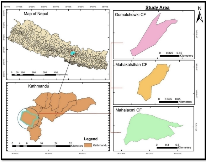 O distrito de Kathmandu está localizado entre a latitude 27,700769° N e a longitude 85,300140° E na região montanhosa da província de Bagmati, no centro do Nepal. É uma bacia intermontanhosa de forma oval que se estende por cerca de 30 km na direção oeste-oeste e 25 km na direção norte-sul e ocupa cerca de 650 km2 e uma altitude varia de 1220 a 1500m. A temperatura média e a precipitação foram de 16,1°C e 1343 mm por ano, respectivamente. Município de Chandragiri localizado na parte sudoeste do vale de Katmandu, na província de Bagmati. Tem uma área total de 43,92 km2. Os CFs Gumalchowki, Mahakalsthan e Mahalaxmi estão entre 1400m e 2580m acima do nível do mar. Principalmente, Katus (Castanopsis indica), Chilauni (Schima wallichii), Salla (Pinus roxburghii), Uttis (Alnus nepalensis), Khasru (Quercus semecarpifolia),