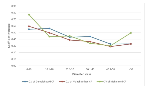 2 ilustra que o coeficiente de variação da classe DAP de 40,1-50 cm de todas as florestas comunitárias foi menor que 0,30 a 0,33, enquanto este foi o DAP mais alto> 50 cm e DAP <10 cm com 0,5 e 0,77. Mostrou que a estaca de carbono foi mais consistente na classe DAP 0f 40,1 a 50 cm, enquanto foi menos consistente para DAP>50 cm.