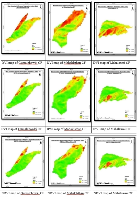 Um total de nove mapas foram produzidos para mostrar os diferentes índice em florestas comunitárias. O valor da reflectância foi estimado para correlacionar com o estoque de carbono na floresta da comunidade usando coordenadas GPS.