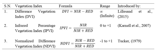 Técnicas de sensoriamento remoto (SR) têm sido utilizadas para melhorar o uso do mapeamento e monitoramento da vegetação (Ingram et al., 2005; Lu et al., 2004; Maynard et al., 2007), que mede a reflexão espectral da vegetação (Zianis et al., al. al., 2005). Em diversas pesquisas, os modelos de índice de vegetação (IVs) baseados em satélites são os modelos mais utilizados para a estimativa da biomassa (Foody et al., 2003; Schlerf et al., 2005; Zheng et al., 2004). Muitos estudos prévios revelaram uma relação positiva significativa entre a biomassa e os índices de vegetação (Steininger, 2000; Zheng et al., 2004, Maynard et al., 2007). Da mesma forma, uma pesquisa na província de Savannakhet, Laos PDR mostrou uma correlação significativa entre a biomassa isolada (AGB) e o valor de reflexão espectral de diferentes índices (Vicharnakorn et al., 2014). No entanto, esses tipos de pesquisas são muito limitados no Nepal. Assim, este estudo foi realizado para estimar o estoque de carbono e mostrar sua correlação com o valor de reflexão dos índices e também dos fatores que afixam o estoque de carbono nas florestas comunitárias.