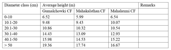 A altura média e a classe de diâmetro variaram na floresta da comunidade. A maior classe de diâmetro foi registrada DAP>50 cm e a altura média dessa classe foi de 19,36, 17,74 e 16,67, enquanto a altura média do caule foi menor na classe DAP (0-10 cm) foi de 6,52, 5,99 e 6,54 mm em Gumalchowki, Mahakalsthan e Mahalaxmi CF, respectivamente (Tabela 2).
