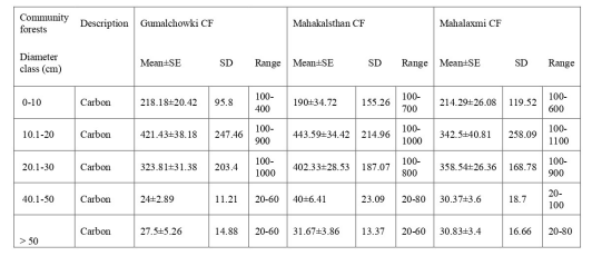 A estatística descritiva do estoque de carbono na floresta da comunidade variou de acordo com a classe de DAP. O estoque de carbono estimado foi o maior na DAP > 50 cm, com 13,47±1,34, 12,25±1,00 e 10,51±0,80 toneladas/ha em Gumalchowki CF, Mahalxmi CF e Mahakalsthan CF, respectivamente. Entretanto, o menor registro de estoque de carbono foi encontrado em DAP<10 cm com 0,13±0,01, 0,14±0,02 e 0,15±0,01 toneladas/ha em Mahakalsthan CF, Mahalaxmi CF e Gumalchowki CF, respectivamente.