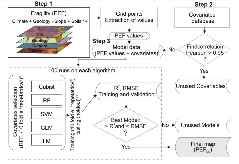 Do mapa do PFE (etapa anterior), extraímos os valores de fragilidade ambiental do mapa para uma nota de 4.800 pontos distribuídos aleatoriamente com distância mínima de 3 km. Esses pontos constituem a principal variável para determinar os níveis de fragilidade ambiental usando a técnica do algoritmo Machine Learning (ML); e o resultado desse procedimento é a geração de um novo mapa, aqui denominado Potential Environmental Fragility by Machine Learning (PEFML). No entanto, para auxiliar a previsão por ML, montamos um banco de dados de covariáveis em formato raster, estruturado em resolução de 1x1 km: cinquenta e cinco dados espaciais do WorldClim (Hijmans et al., 2005); 42 covariáveis geomorfométricas da Shuttle Radar Topographic Mission (SRTM) (USGS, 2023), extraídas utilizando o software SAGA (Olaya e Conrad, 2009; Sena et al., 2020); Um dado de espectrometria gama e um de gravimetria (Heineck et al., 2003), um NDVI calculado a partir de imagens de satélite do sensor MODIS (Moderate Resolution Imaging Spectroradiometer) de agosto de 2019 (USGS, 2023), que é o mais seco e mostra a diferença mais significativa entre fitofisionomias. As variáveis solo, geologia, clima, não foram incluídas para evitar previsões invejadas, pois faziam parte da geração PEF.