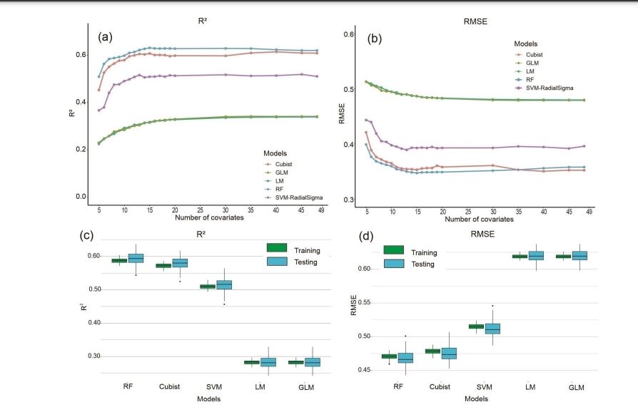 A etapa anterior gera uma estrutura de dados com valores de variáveis (PEF) e valores de covariáveis, mas o número excessivo de covariáveis também favorece a criação de modelos superestimados (Gomes et al., 2019; Padarian et al., 2020). Portanto, aplicamos um corte de correlação para eliminar covariáveis altamente correlacionadas, pois elas têm uma contribuição semelhante para explicar a distribuição de uma variável analisada. A função usada foi encontrar correlação, parametrizada pelo critério de corte de correlação >0,95 Pearson (Kuhn e Johnson, 2013). Além disso, aplicamos uma importante ferramenta de seleção de covariáveis usando uma ferramenta amplamente utilizada em modelos de previsão, chamada Recursive Feature Elimination (RFE), que também evita previsões superestimadas. O RFE é um método de seleção de características inversas no conceito central baseado na eliminação de covariáveis sem importância (Kuhn e Johnson, 2013). Após remover a covariável menos importante, o RFE reajuste o modelo com um conjunto menor de covariáveis, reiniciando o processo para eliminar a covariável menos importante; e este processo é repetido várias vezes até a stabilizationção em que o nível de precisão determinado por R-quadrado (R2 ) não diminui. Este processo é realizado com base apenas no dataset de treinamento que foi 75% das amostras, enquanto os outros 25% são utilizados no processo de teste (holdout-test). No aprendizado de máquina, a fase de teste é um processo para avaliar o desempenho de um modelo treinado com um conjunto de teste (ou seja, 25% das amostras), que não foi visto pelo modelo na fase de treinamento.