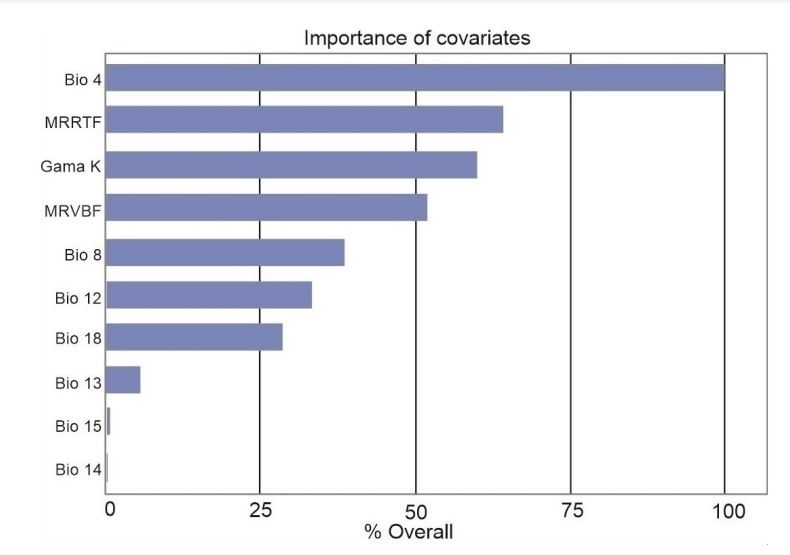 O processo preditivo do PEFML envolve cinco algoritmos e banco de dados de covariáveis com dados climáticos, topográficos, geoquímicos e de vegetação, com níveis de correlação de 0,95 nessas covariáveis. Ao aplicar a função RFE para selecionar covariáveis importantes, observamos que aproximadamente doze covariáveis é o número máximo para gerar R 2 mais altoe menor RMSE nos algoritmos utilizados (Figura 3 a,b). O algoritmo Random Forests apresentou o melhor desempenho na seleção do RFE, selecionando apenas 10 covariáveis classificadas por nível de importância (Figura 4). De acordo com o ranking (% global), os dados bioclimáticos do WorldClim foram predominantes e mais significativos. Dentre as variáveis topográficas, apenas MRRTF (MRTF: multiresolution ridge-top planness index), que indica posições planas em áreas de alta altitude, e MRVBF (MRVBF: multiresolution valley bottom planness index), que mostra superfícies planas no fundo do vale, foram incluídas na modelagem. Além dessas, uma covariável de spectrometria gama do elemento K ocupou o terceiro nível de importância. Esta covariável, além de indicar a espectrometria de raios gama para o potássio (40 K), também pode ser correlacionada com um certo volume do elemento na superfície. Portanto, Random Forest foi selecionado por precaução, pois de 100 execuções gerou >R 2 (treinamento 0.61, teste 0.59)