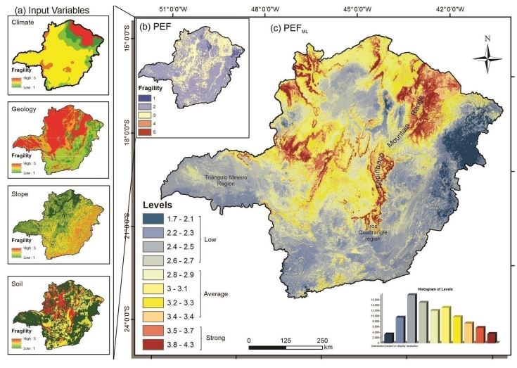 Por exemplo, a previsão capta a influência da geomorfologia no aumento do nível de fragilidade ambiental em áreas de maior declividade no contexto da região central, onde há relâmpagos de forte declínio (por exemplo, Serra do Espinhaço), e em áreas íngremes, como as planícies da região noroeste. Fatores geológicos e edáficos também contribuem para áreas de média e alta fragilidade, principalmente em áreas com maior variação pedagógica e geológica, como as regiões central e norte do estado (Iglesias e Uhlein, 2009; Silva et al., 2018). Além disso, a região norte tem adicionado fator de condições climáticas de baixa precipitação para contribuir para maiores níveis de fragilidade; Esta parte do estado inclui o limite do semiárido brasileiro.