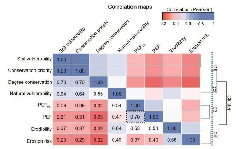 Além da semelhança do padrão espacial entre o mapa PEF pelo método convencional e o mapa PEFML derivado do aprendizado de máquina, também houve uma forte correlação estatística entre esses mapas (Pearson 0,70); e esses dois mapas estão no mesmo cluster (C3) (Figura 6), confirmando o nível de similaridade. Dessa forma, comparamos os mapas de fragilidade ambiental das metodologias (PFE e PEFML) com outras informações ambientais sobre risco e vulnerabilidade ambiental disponíveis para o estado de Minas Gerais (Scolforo et al., 2008). O PEFMLmapa sempre mostrou uma correlação superior com mapas de risco e vulnerabilidade, indicando que é potencial mais explicativo de otherros fatores ambientais: vulnerabilidade do solo, prioridade de conservação, grau de conservação, vulnerabilidade natural, erodibilidade e risco de erosão. Por outro lado, o mapa PEF apresentou valores fracos em todas as correlações com esses mapas (Figura 6).