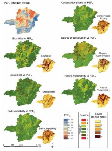 Para observar a variação entre o PEFML e o método original (PEF), uma nova grade de pontos foi criada com 4,800 pontos aleeatórios, com posterior extração dos valores PEFML e PEF. Além disso, essa análise estatística foi disponibilizada para Minas Gerais (Mapas: Grau de conservação, Risco de erosão, Vulnerabilidade natural, Prioridade de conservação, Vulnerabilidade do solo, Erodibilidade). Esses mapas fazem parte do trabalho compilado do zoneamento agroecológico de Minas Gerais disponibilizados em dados matriciais (raster), com intervalos de 1 a 5, faixa compatível com o PEFML