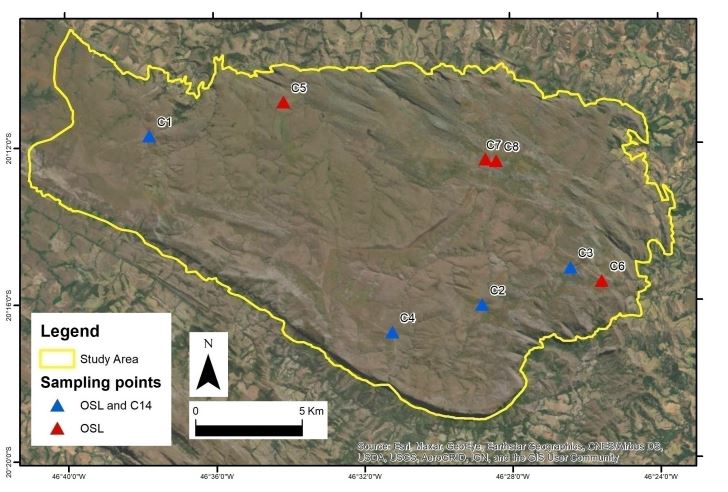 A configuração desta paisagem, associada aos estudos preliminares acima referidos, levantou algumas questões sobre a idade tanto dos materiais y das surfaces encontradas nesta area. O objetivo desta pesquisa é conhecer os materiais superficiais utilizando a técnica de Luminescência Opticamente Estimulada (OSL) para depósitos de quartzo e Carbono-14 (14C) para materiais orgânicos.