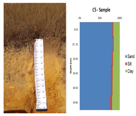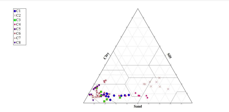 5 mostra os resultados da análise granulométrica realizada para os perifis, que mostraram nítido predomínio de areias e siltes. As amos C2 e C4 apresentam algumas tendências diferentes devido a uma maior proporção de silte sem variação de textura em profundoe. Nenhuma das 8 parcelas teve variação relevante quanto à depthe, sendo que nos perfis as texturas permanecem praticamente as mesmas apresentadas na amostra C7 Figura 6.