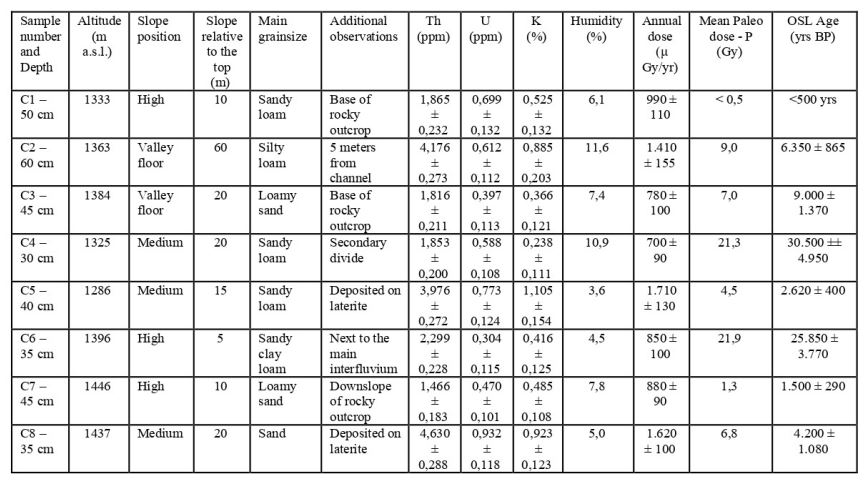 Os resultados dos dados de OSL revelam que as condições topomorfológicas afetam claramente as condições de erosão/deposição, o que diminui as chances de os sedimentos serem expostos à radiação e permanecerem no sistema de declividade. As áreas próximas à fazenda Vale (C2 e C3) apresentam áreas do Baixo Holoceno entre 6350 ± 865 e 9000 ± 1370 anos AP.