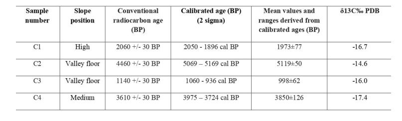 Além disso, o fato de as amostras mas antigas de nosso estudo serem provenientes de áreas cerca à base da encosta que apresentam condições de deposição más favoráveis. Isso é consistente com os resultados apresentados por Paisani et al (2017), que relatam que a erosão intensa nas costas coluviais leva à deposição de sedimentos e acreção de sedimentos no vale e seis depósitos de sedimentos. A Tabela 2 mostra a datação AMS 14 C de 4 parcelas da área de estudo. De acordo com os resultados, a amostra C2 tem a idade mais avançada de 14 C (4460 ± 30 anos BP). O perfil desta amostra que está localizada perto de um fundo de vale é o mais espesso das parcelas amostradas.