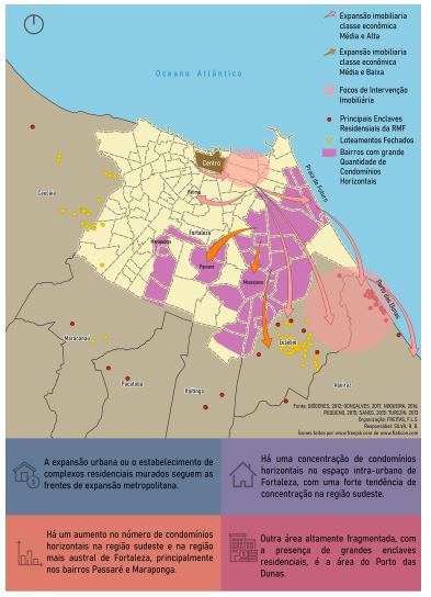 A dispersão geográfica dos grupos de renda média e alta foi alcançada pela implantação gradual das "cidades-fortaleza" e seus respectivos sistemas de segurança e vigilância e exerceu enorme influência na dinâmica metropolitana metropolitana. leste e sudeste da capital; Por outro lado, a expansão da oferta de lotes privados, lotes multiuso (Aphavilles) e condomínios da praia é um fenômeno metropolitano, materializando um padrão de habitação urbana fragmentada tanto em áreas consolidadas quanto em trechos de urbanização dispersa. Todas as empresas que fragmentam o espaço urbano caracterizam-se por maior autonomia e dissociação do ambiente imediato; no entanto, também tem conexões com os espaços centrais e os grandes centros de consumo do município de Fortaleza.2