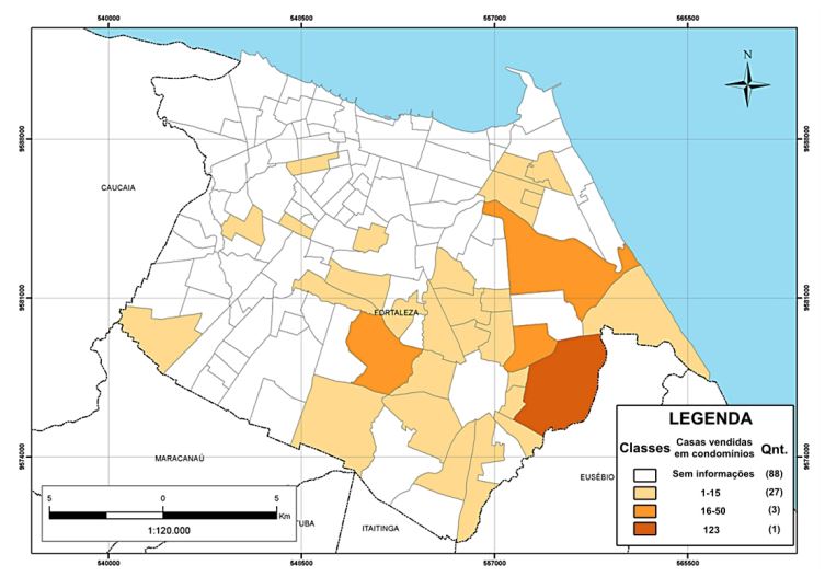 A análise da "Oferta de condomínios residenciais na cidade de Fortaleza (Figura 2) permitiu identificar uma significativa concentração espacial de condomínios de alto padrão nos bairros De Lourdes e Manuel Dias Branco, e de condomínios de pequeno e médio porte nos bairros De Lourdes e Manuel Dias Branco, e de condomínios de pequenas e médias empresas destinados a média renda, Sapiranga/Coité, José de Alencar (antigo Alagadiço Novo), Edson Queiroz, Lagoa Redonda Engenheiro Luciano Cavalcante, Cidade dos Trabalhadores, Parque Manibura e Cambeba e Messejana.