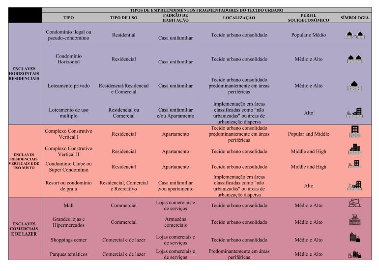 Entende-se que a produção excessiva e o desenvolvimento de novos tipos de enclaves residenciais são crescentes, rompendo a unidade do ambiente socioespacial e a reorganização interna do espaço urbano a partir de fragmentos urbanos. A separação entre os que estão "dentro e os que estão fora dos muros" e os que são "condomínios privados" é uma marca simbólica e material da mudança no padrão de segregação contemporâneo, que produz descontinuidades no meio urbano imediato e gera um redirecionamento da sociabilidade nas ninhadas da sociedade. de médio e alto desempenho para espaços comuns em enclaves residenciais e grandes equipamentos de consumo segmentado disponíveis em novas centralidades (SALGUEIRO, 1998; CALDEIRA, 2000; BAUMAN, 2007; SPÓSITO, 2011; DAL POZZO, 2015).