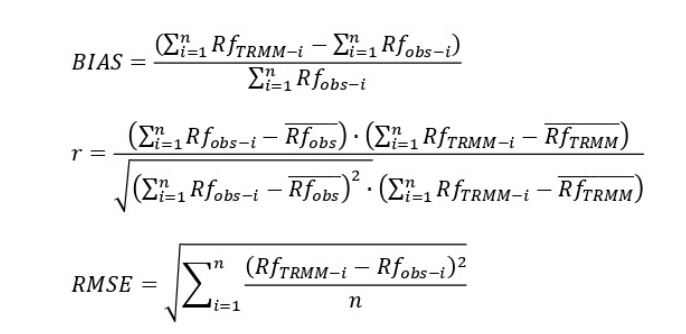 [#form1en.jpg]onde Rf obs-i é observada precipitação, RfTRMM-i é o valor estimado de precipitação de TRMM 3B43; Rf obs é a precipitação média observada e Rf TRMM é a precipitação média estimada pelo TRMM de 3B43; n é o número de observações.
