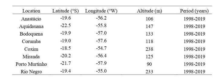 Informações básicas sobre os dados de estações meteorológicas convencionais e observações de satélite utilizadas neste estudo são descritas na seção a seguir. Foram compiladas as séries históricas de dados pluviométricos de 8 estações meteorológicas do Pantanal Sul-Mato Grosso - MS (Figura 1) para o período de janeiro de 1998 a dezembro de 2019. O local e o período de observação são apresentados na Tabela 1. Os dados foram obtidos do banco de dados hidrometeorológicos da Agência Nacional de Águas (ANA) - (ANA, 2020), disponível no Hidroweb - Sistema de Informações Hidrológicas (http://www.ana.gov.br/), e do banco de dados meteorológicos do Instituto Nacional de Meteorologia (INMET). Os dados foram fornecidos como precipitação diária cumulative em millimeters para cada estação.