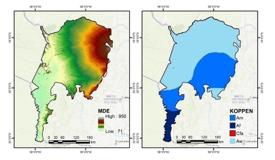 Em segundo lugar, pela classificação de Köppen, a maior parte do território está na zona de clima tropical (Alvares et al., 2013). No Pantanal existem os seguintes tipos de clima: do tipo Aw (tropical com estação seca de inverno) com duas estações bem definidas: i) seco (máximo a sete) e ii) chuvoso (de abril a abril) (Teodoro et al., 2015) ou do estado de Mato Grosso (região do Pantanal), com precipitação pluviométrica anual de 1.400 mm. O clima do tipo Am (subtropical e subsubumid) aparece no oeste de Mato Grosso do Sul, no baixo-pantanal, onde a precipitação anual varia entre 1.300 e 1.600 mm, e também na região central do estado, onde a maior precipitação pluviométrica é alta e de 1.900 mm por ano. O clima do tipo Af (tropical ou superumida) aparece no sudoeste de Mato Grosso do Sul, no sul do Pantanal, nas localidades mais ao sul, e sempre em altitudes abaixo de 400 m, onde a precipitação anual varia entre 1.400 e 1.800 mm. Em uma pequena localidade, nas terras altas do Pantanal, a uma altitude de 900 m, observa-se o clima do tipo Cfa (clima subtropical quente de verão) (Alvares et al., 2013).