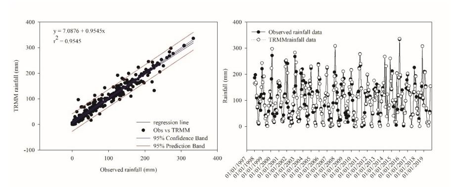 A precipitação média anual durante o período de estudo foi de aproximadamente 1292 mm para as estações meteorológicas convencionais e variou de 307 mm na estação seca (abril a setembro) a 927 mm na estação chuvosa (março a março), mostrando que a maior precipitação foi observada na planície. A precipitação média anual foi de aproximadamente 1.322 mm para o TRMM e varia de 326,9 mm na estação seca a 936 mm na estação chuvosa