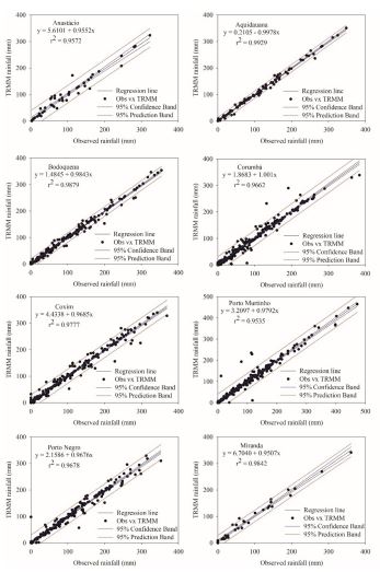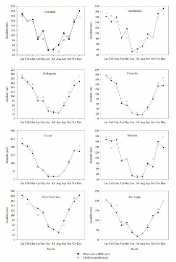 Os resultados das correlações mensais para cada região indicam que os dados estimados pelo TRMM apresentam uma boa concordância (em média 90%) com os dados das redes de estações meteorológicas. Além disso, as mensagens de análise indicam que o RMSE, frequentemente utilizado para verificar as diferenças entre os dados estimados e observados, tem valores médios entre 15,8 mm. Além disso, os dados do TRMM mostram uma tendência média de superestimar a precipitação mensal em 3,8%. No entanto, as estimativas de precipitação apresentam variações sazonais muito semelhantes aos dados observados nas estações meteorológicas, para cada região de estudo.