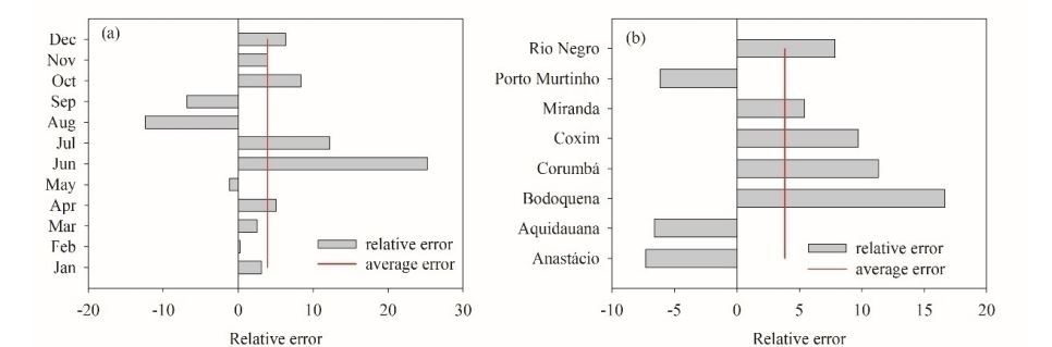 O erro relativo mostrou que o satélite tende a subestimar/superestimar a precipitação média mensal, pois os valores encontrados foram negativos/positivos, logo ou satélite tende a superestimar os dados médios mensais de precipitação em 3,8% para os 22 anos de análise para o período anual. Para o período seco, a superestimação do satélite foi superior a 25,2%. Esses resultados corroboram com Collischonn et al (2007), que encontraram visões positivas de 8% no estado de Páraguai de Mato Grosso, e Viana et al (2008) que encontraram resultados positivos em torno de 7% na região sul do Brasil, onde afirmam que o produto 3B42 tende a superestimar a precipitação (Figuras 5a eb). O maior erro relativo foi para o município de Bodoquena, com 16,6% (Figura 5b).