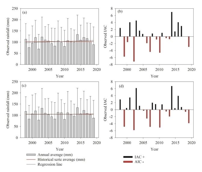 A metodologia utilizada para o cálculo do Índice de Anomalias de Chuva (IRA) foi adotada por Oliveira e colaboradores (2020) para o Estado de Mato Grosso do Sul. As Figuras 6a e 6b mostram a média anual e histórica das séries e tendências e os valores RAI para CMS e as Figuras 6d para estações de dados de satélite TRMM para os anos de 1998 a 2019.