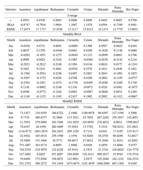 Verifica-se que os maiores valores do BIAS não são superiores a junho (Tabela 2) como também observado por Camaparotto et al (2013). O maior valor de BIAS foi de 0,48 para a estação de Bodoquena em junho e o maior valor de RMSE foi de 1688,30 para a estação de Miranda em dezembro. Essa característica pode ser explicada devido às chuvas convectivas, que geralmente são fortes e ocorrem de forma pontual (Camparotto et al., 2013).
