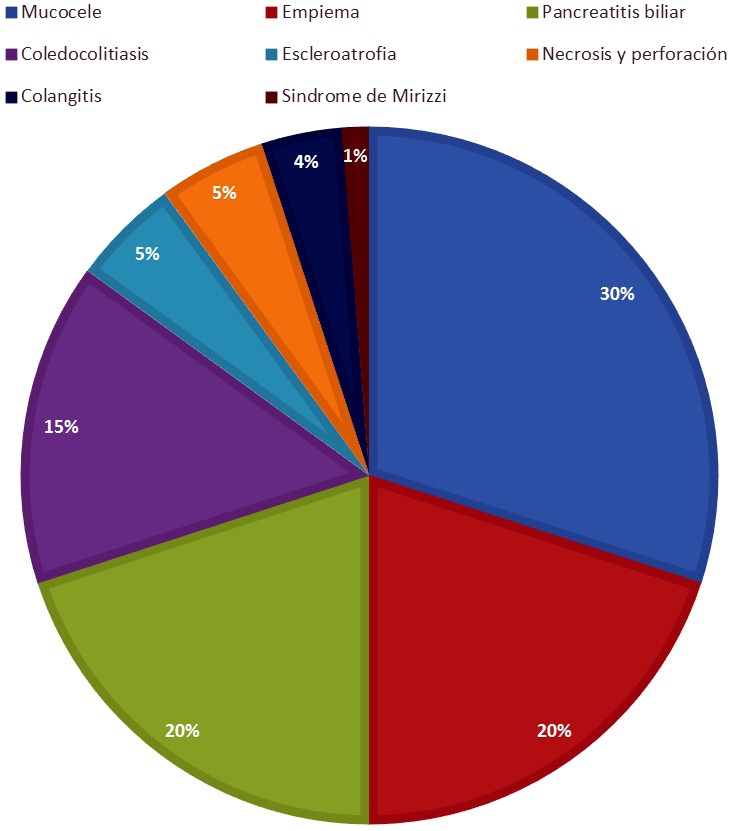 Se incluyeron 124 pacientes (60,8%) en el grupo I (grupo con colecistitis aguda sin otra complicación), mientras que se incluyeron 80 pacientes (39,2%) en el grupo II (grupo con pacientes con colecistitis complicada). Se encontraron 24 (30%) pacientes con mucocele, 16 (20%) con pancreatitis biliar, 16 (20%) con empiema, 12 (15%) con coledocolitiasis, 4 (5%) con eslceroatrofia, 4 (5%) con necrosis y perforación, 3 (4%) con colangitis y 1 (1%) síndrome de Mirizzi (Figura 1).