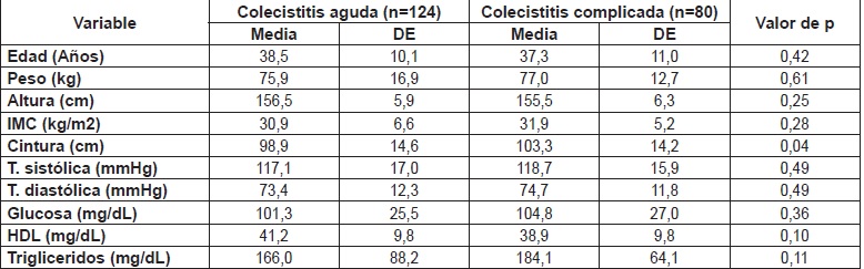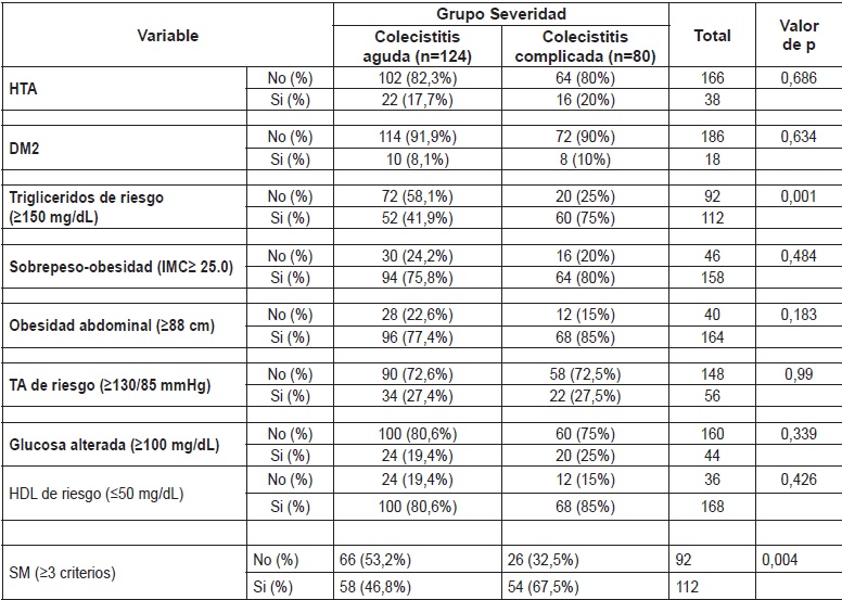 Abstract: Objective: observe the prevalence of metabolic syndrome in patients with cholecystitis and analyze the relation with its severity. Materials and Methods: cross-sectional study in female patients with acute cholecystitis. Divided into two groups: group I - patients with acute cholecystitis without any other complication and, group II - patients with acute cholecystitis with any complication as: mucocele, empyema, choledocolithiasis, cholangitis, biliary pancreatitis, necrosis and, perforation. Variables measured were: weight, body mass index, waist, blood pressure, blood glucose and lipids levels, type 2 diabetes, arterial hypertension, dyslipidemia, and metabolic syndrome. Results: of 204 patients studied, 80 (39,2%) patients were complicated. There were statistical differences between groups in waist (98,9 cm vs 103,4 cm; p=0,04), patients with risk tryglicerides level (≥150 mg/dL) (41,9% vs 75%; p=0,001), and presence of metabolic syndrome (46,8% vs 67,5%; p=0,004). However, when adjusted logistic regression were realized, just risk tryglicerides level (≥150 mg/dL) were found as real risk factor (OR 4,058, IC 95% 1,870-8,807; p=0,000) for complicated cholecystitis group. Conclusion: neither metabolic syndrome nor waist circumference appear as risk factors for complicated cholecystitis, however, if the patients present tryglicerides level ≥150 mg/dL, the risk for complication increases significantly.