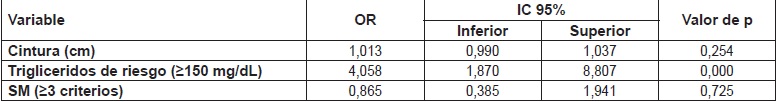 Sin embargo, cuando se compararon las proporciones de las condiciones asociadas se encontraron diferencias estadísticamente significativas en las variables: triglicéridos de riesgo (≥150 mg/dL) (41,9% vs 75%, p=0,001), y SM (≥3 criterios) (46,8% vs 67,5%, p=0,004) (cuadro 2).