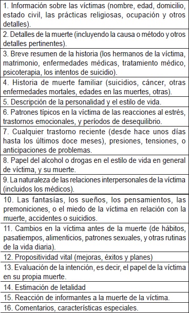 En este instrumento, nacido en 1958, hay una participación conjunta de médicos y psicólogos, los cuales se enfocan en la investigación de las razones que tuvo la persona para terminar con su vida. Además este método es útil para determinar el tipo de muerte, y así ayudar a los patólogos forenses [46].