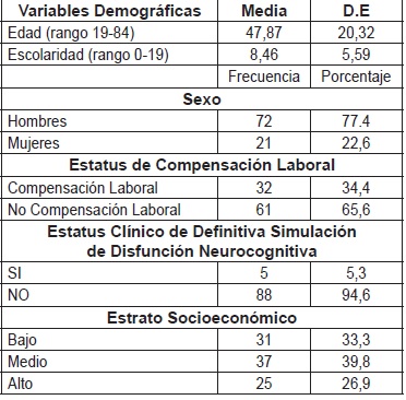 La información demográfica de los participantes se presenta en la Tabla 1. Los participantes en total fueron 93 adultos (72 hombres y 21 mujeres). Los participantes del primer grupo fueron evaluados en un periodo de un año en Medellín, Colombia, con el propósito de llevar a cabo una evaluación neuropsicológica para definir su estado cognitivo. Todos habían presentado Traumatismo Craneoencefálico durante sus actividades laborales y en el momento de la evaluación se encontraban en proceso de definir la posible compensación laboral.