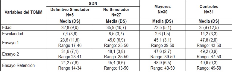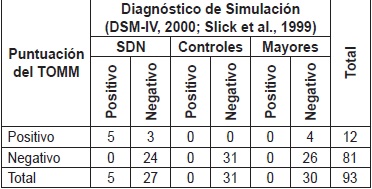 De los participantes con estatus clínico de Simulador de acuerdo con los criterios diagnósticos del Manual de Diagnóstico y Estadística-IV Texto Revisado [23], el 100% obtuvieron puntuaciones por debajo de 45 en el ensayo 2 del TOMM, que corresponde a 5 participantes del Grupo SDN, y los otros siete (7) participantes aun cuando obtuvieron puntuaciones por debajo de 45 en el ensayo 2 del TOMM, no cumplieron con los criterios diagnósticos para simulación, sino que se debió a otros diagnósticos neuropsicológicos, tales como severas alteraciones mnésicas, demencia Post TEC y Síndrome del Cuerpo Calloso (n= 3), y los otros participantes clasificados por el TOMM como posibles SDN, son personas con probable diagnóstico de Deterioro Cognitivo Leve (n= 4) con edades superior a los 79 años.