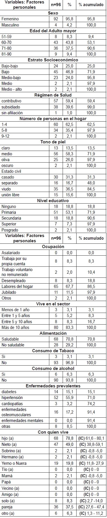 Variables: se consideró como variables independientes las características sociodemográficas o factores personales específicamente aspectos relacionados con el sexo, edad, estrato social, afiliación al sistema de seguridad social en salud, personas que conforman el hogar, estado civil, nivel de escolaridad, ocupación, tiempo de vivir en el sector, hábitos de vida y enfermedades crónicas.