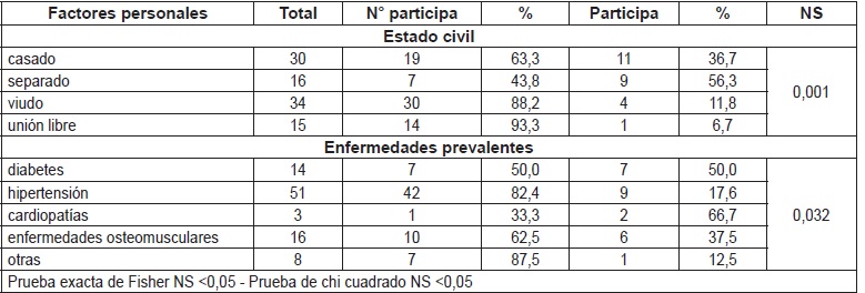 En la Tabla 2 se evidencia que los factores personales relacionados con la participación de los adultos en actividades productivas y de tiempo libre, fueron estado civil y enfermedades crónicas, las cuales fueron estadísticamente significativa (NS<0.05).