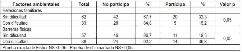 En cuanto a los factores ambientales se encontró que alrededor de 40% de los adultos participantes en el estudio no encuentran apoyo dentro de sus hogares, 60,4% perciben barreras físicas en la comunidad relacionadas con la inseguridad, la violencia, vías despavimentadas y distancias prolongadas, 12% manifiestan sentirse rechazados en comunidad y 76% de los participantes en el estudio han tenido dificultades en la prestación de los servicios en salud.