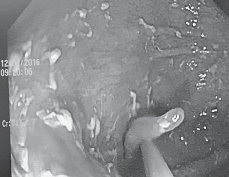 Hombre de 46 años de edad, que consulta por sangrado rectal abundante, que requiere tratamiento con reanimación y transfusión de glóbulos rojos empaquetados. Después de estabilizar se realizó la colonoscopia total, en ese momento sin encontrar evidencia de sangrado activo. En el colon ascendente medio se encontró un pedículo de aproximadamente 3 cm de longitud (Figura 1), sin evidencia del pólipo (Figura 2).
