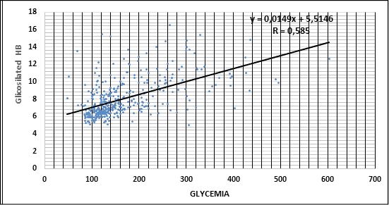 There was a low degree of positive correlation between the values of fasting glycemia and the glycosylated hemoglobin, the Pearson correlation coefficient (R) was 0.58; the goodness of fit, expressed as R2= 0,34; p value (Prob >F) =0,0000 (Figure 1).