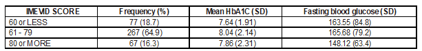 In measuring the lifestyle of diabetics, the starting suppose, is that when higher scores are in the IMEVID instrument, the levels of fasting blood glucose and glycosylated hemoglobin must be lower. The mean score of the IMEVID test was 69.73 (SD = 9.62, range 40-94); Table 2 shows the mean values of glycosylated hemoglobin and glycemia in relation to the score group reached in the IMEVID questionnaire. There were no statistically significant differences between the groups (p> 0.05).