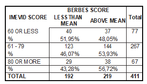 In the assessment of the degree of knowledge that patients have about the disease, the mean score was 13.32 (SD = 4.5, range 4 - 23). Almost half, that is, 46.72% (n = 192) of the subjects scored below the mean; Table 3 correlates the scores obtained in the IMEVID and Berbés tests by the patients included.