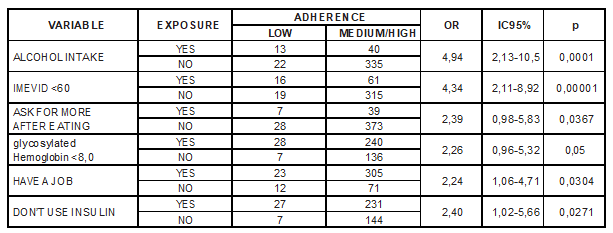 In an exploratory way, there were sought to establish some degree of causal association between the low level of pharmacological adherence with some factors present in the corresponding instruments. Table 4 shows the most significant correlations that were found.