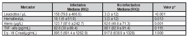 La metodología de investigación de tipo transversal no permitió determinar el estado de la infección en los pacientes, lo cual configura una importante dificultad en el análisis de los resultados. Por otro lado, en futuros estudios se deberían ensayar otras metodologías para la determinación de la capacidad antioxidante ya que la empleada en este estudio pudo estar sesgada positivamente por la elevada concentración de hierro.