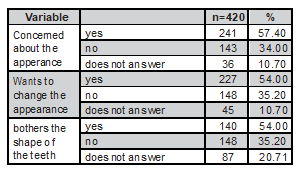 Almost 60% are concerned about their dental appearance, 54% would like to change and it bothers them at 54% (Table 7).