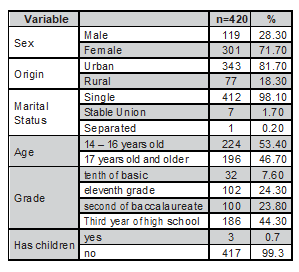 The female - male ratio is 2.5 to 1. The majority of students are from the city and single (98.10%); with regard to age, there is no difference between middle and late adolescence, within this group only 0.7% (3 adolescents) have children (Table 1).
