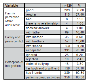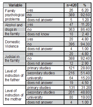 More than 90% do not report family psychological problems, family violence, or judicial problems in the family; however, 11.20% report that there are alcohol and drug problems in the family. There are no great differences between the level of education of the father and the mother. The majority of adolescents live with their parents (59.30%) and only with their mother 30%. (Table 2).