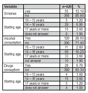 13.10% of adolescents smoke, 28.60% consume alcohol and 6.7% consume drugs. The most frequent starting age is between 14 - 16 years, for the use of tobacco, alcohol and drugs. (Table 5).