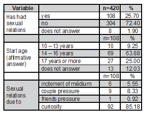 1 out of every 4 students has had sexual relations, the most frequent starting age was between 14 and 16 years old (70%). The main reason for the start, was out of curiosity. (Table 6).
