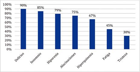 En cuanto a la descripción clínica de la sintomatología presentada durante el consumo de Basuco, (no se tiene estimada dosis en la que inician síntomas o sobredosis hasta la fecha) se encontraron en orden de frecuencia delirios, insomnio, hiporexia, alteraciones motoras y en último lugar algunos síntomas depresivos (Figura 1); los delirios descritos fueron de tipo persecutorio (90%) y de grandiosidad (83%), por lo que el 93,5% expresó presentar aislamiento social y disminución del deseo de interactuar con otras personas, adicionalmente se resalta que ninguno de los pacientes refirió presentar durante el consumo sensación de placer intensificado y contrariamente el 18% refirió que presentaba disminución de las sensaciones placenteras.