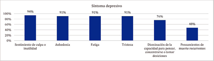 Los síntomas depresivos se encontraron predominantes durante la abstinencia (Figura 2), con inicio inmediatamente posterior al cese del efecto de la SPA; en cuanto a su duración el 72,7% de los pacientes refirió persistencia de estos síntomas hasta volver a consumir y el 23,7% restante refirió presentarlos únicamente durante los 3 días posteriores al último consumo. Por otro lado, la irritabilidad y agresividad fueron reportadas en un 94% y 79% respectivamente, ambas con una duración hasta un nuevo consumo en el 45,5% de los pacientes, solo durante el primer día en el 37,3% y con duración de 7 días en el 17,2%, con inicio en el 100% de los que las refirieron inmediatamente posterior al cese del efecto de la SPA.